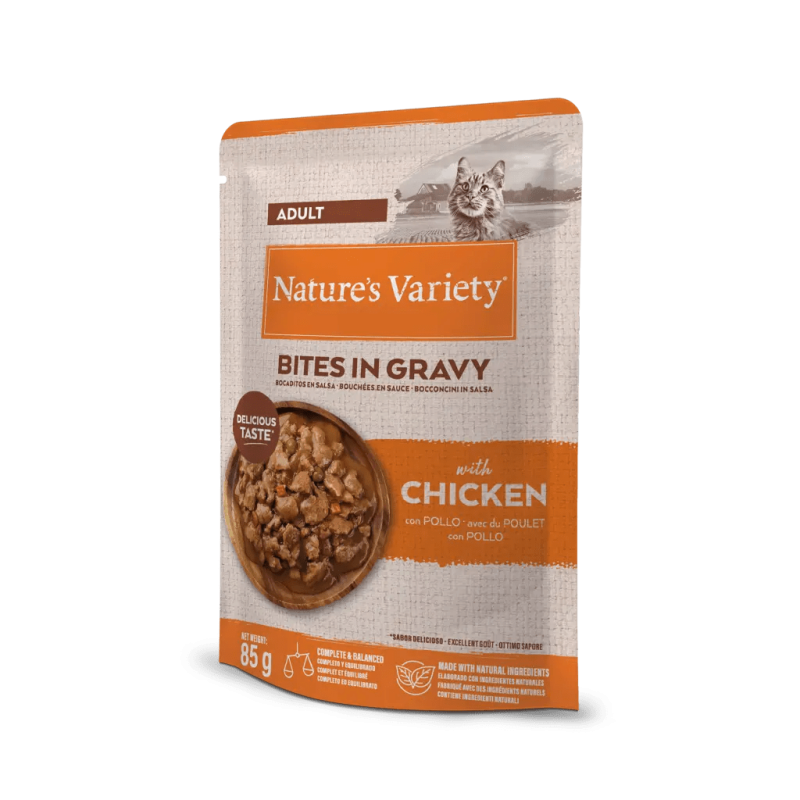 Bocados de pollo en salsa. Cocinados al vapor en sus propios jugos y a temperatura óptima para una mejor conservación de nutrientes.